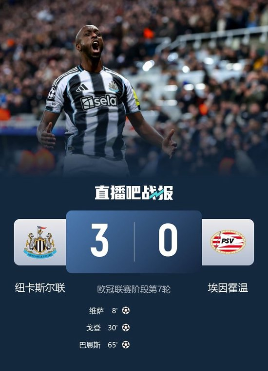 直播吧1月22日讯 北京时间4:00,欧冠联赛阶段第7轮纽卡斯尔联vs埃因霍温,比赛在圣詹姆斯公园球场打响!上半场,维萨破门帮助纽卡取得领先!随后维萨又前场抢断,助攻戈登再下一城!下半场,巴恩斯再下一城。最终,纽卡3-0完胜埃因霍温,暂升欧冠积分榜第7。