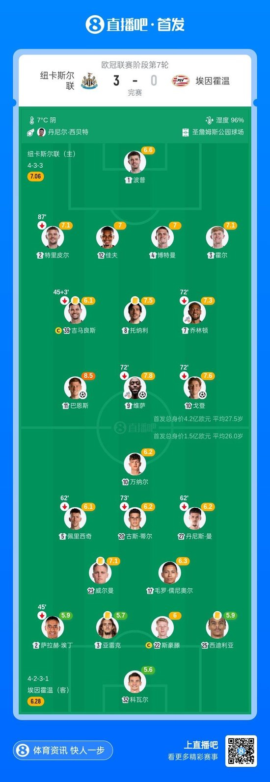 第8分钟,埃因霍温门将大脚被断,纽卡中场直接一脚直塞,乔林顿禁区内左侧横传,维萨将球打进球门!纽卡1-0领先埃因霍温↓